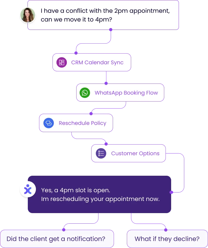 or cancel appointments in real-time. If a slot isn't available, I can suggest alternatives or send a link via WhatsApp for the customer to browse options visually.