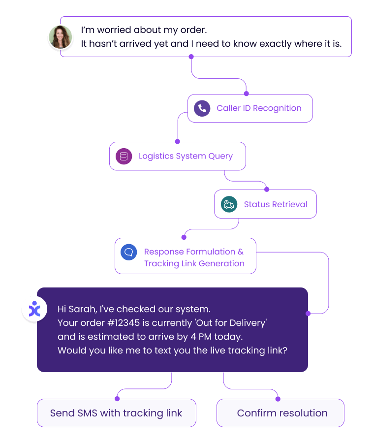 I recognize the caller ID, check your logistics system instantly, and provide the exact status.