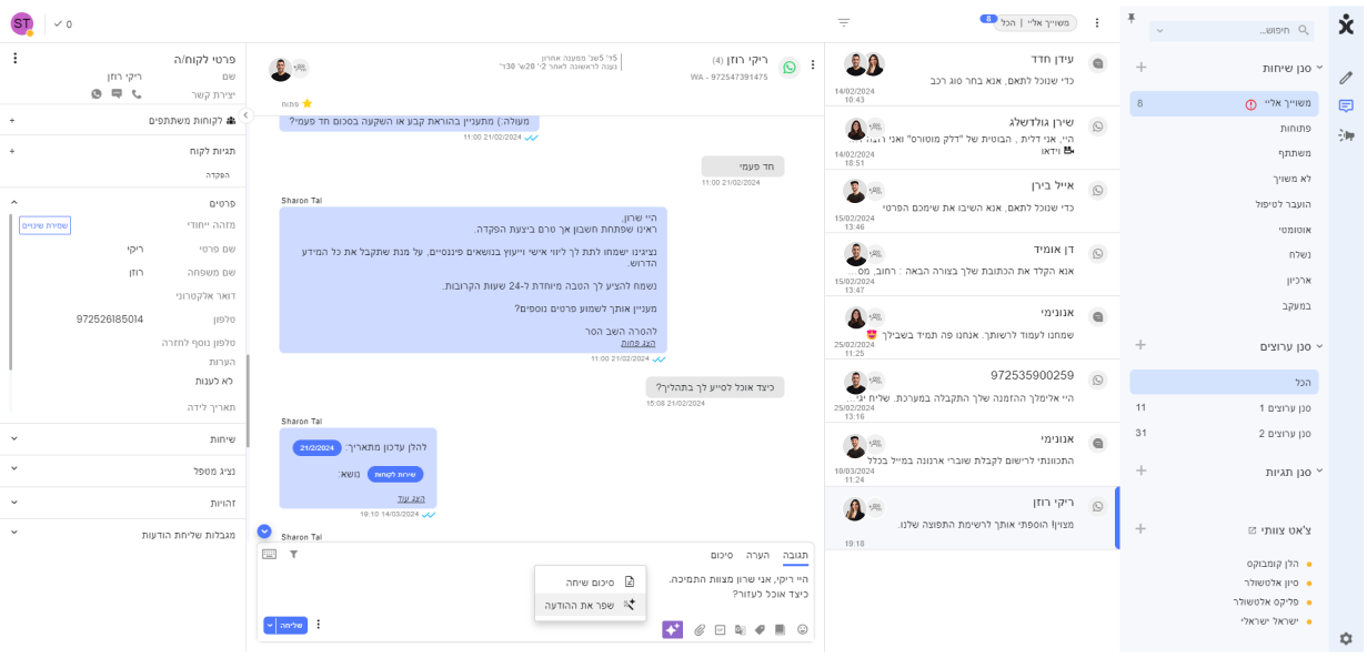 סנן השיחות והערוצים תמיד יעבדו יחד – יש לבחור את שני הסננים, לדוגמא: בחר בסנן שיחות פתוחות ובחר בערוץ הווטסאפ. שני סננים אלה תמיד יופיעו, לעומת סנן תגיות.